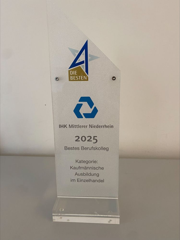 Das Berufskolleg an der Weingartstraße in Neuss wurde im Rahmen der jährlich stattfindenden Jahresbestenehrung der Industrie- und Handelskammer (IHK) Mittlerer Niederrhein bereits zum sechsten Mal als bestes Berufskolleg des IHK-Bezirks im Fachbereich Handel ausgezeichnet.